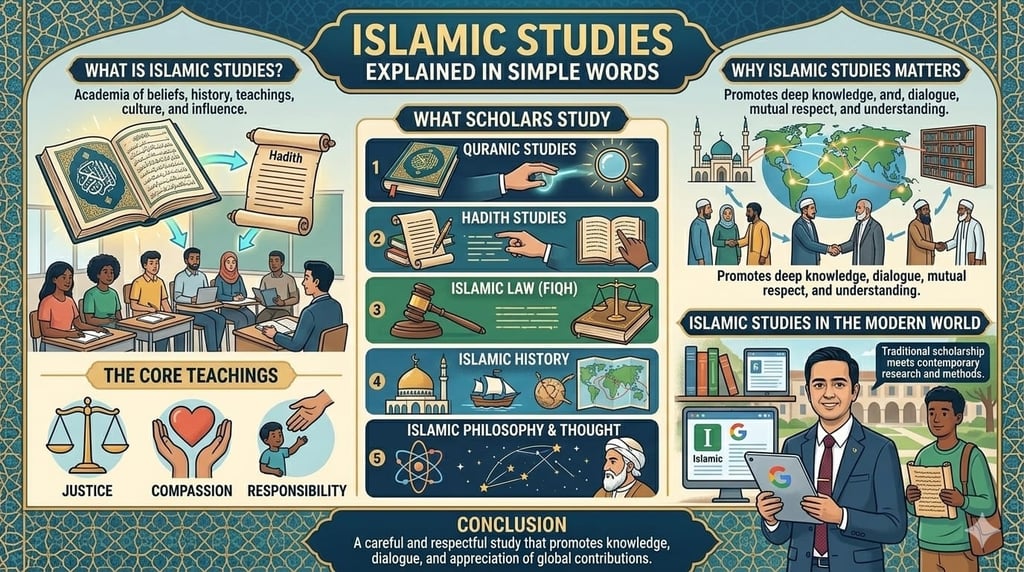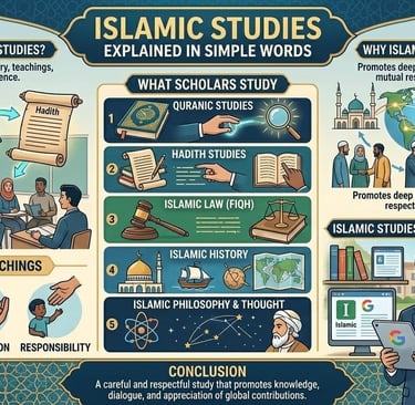 In simple terms, Islamic Studies is the study of Islam, its teachings, texts, history, and ideas. It helps people understand how Islamic beliefs shape the lives of millions of individuals and how Islamic civilization has contributed to global knowledge and culture.